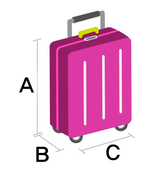 크기(삼변 길이의 합): A + B + C = 158cm 이내(손잡이와 바퀴 포함, 가방의 모양과