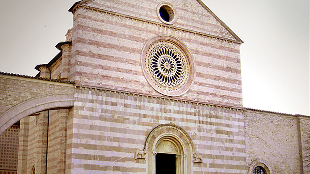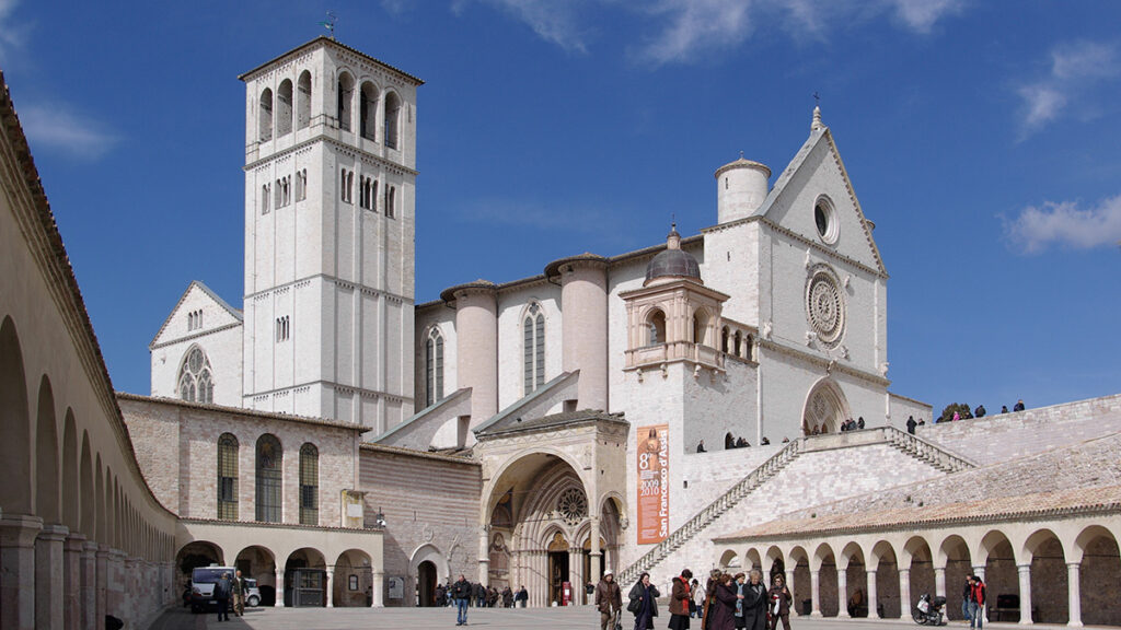불리게 됨”이라고 불리우는 아시시의 서쪽 언덕에 세워진 성당으로 시에나 대성당과 같은 시대에 세워진 고딕 양식으로 지어졌다. 아시시의 대성당의 설계자는 성 프란치스코의 제자인 엘리아 형제에 의해 건축되었다. 성 프란치스코 대성당은 지하 무덤과 1층 성당, 2층 성당으로 구성되어 있다. 프란치스코 성인의 무덤 위에 1층 중앙제대와, 그 위의 2층 중앙제대가 있다. 지하 무덤으로 내려가면 올라가는 계단과 내려가는 계단 사이의 야고바 부인의 유해함이 있고, 몇 계단을 더 내려가면 중앙에 기둥내의 석관에는 프란치스코 성인의 무덤이고 그 옆을 모퉁이에는 네 명의형제가 묻혀 있는데 그든은 레오, 마쎄오, 루피노, 안젤로 형제들이다. 대성당의 1층을 들어가면 성 마르띠노 소성당, 성녀 막달레나 소성당, 성모 마리아와 성 프란츠시코의 벽화, 그리고 중앙 제대와 아치형 천장이 있고, 석양의 성모가 있다. 대성당의 2층은 1층 성당과는 달리 매우 환하면서도 잘 정리된 짧은 중앙복도로 되어 있다. 2층은 성 프란치스코의 생애를 지오또의 작품으로 그려져 있다. 그 중의 한 작품인 새들에게 한 설교는 우리에게 많이 알려진 작품이다. 그리고 마지막으로 볼 것은 유물 소 성당인데, 이곳에는 프란치스코 성인의 수도복과 성인이 부제시절 성찬 전례 때에 사용되었던 성작과 이집트의 술탄에게 받았던 “상아로 만든 피리”등 프란치스코 성인께서 사용하셨던 물건이 있다.