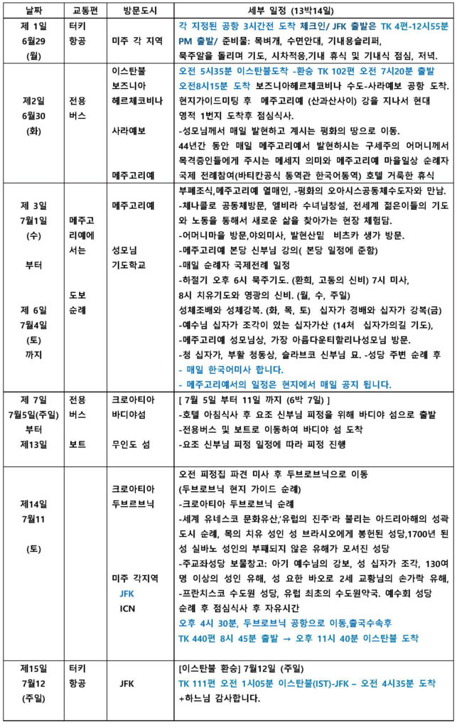 * 상기 일정은 기상조건, 항공사의 변경 사정 및 현지상황 등으로 변경 될 수